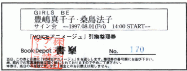 The Girls Be signing session for Voice Animage volume 15 took place at the Shoraku bookstore in Saitama (Kita Yono) on August 1, 1997 [another weekday event]. Althought it was a Girls Be event, each person only got to go up to one of the girls to have the magazine signed, and to shake hands with her. Kuwashima Houko was sitting on the left and Toyoshima Machiko was sitting on the right of the table. The magazines were already pre-signed by one of the girls, and the other girl signed the magazine in front of you. Everything went by pretty fast, close to 300 people in under one hour, so I hardly got a glance at Houko. (^_^;) Machiko said, "Thank you for coming all the time." Machiko was wearing a green, blue, white (and maybe some other colors too) checkered one piece, without sleeves (just straps at the shoulders). Maybe she was wearing a black tank top underneath too. She had blue clips in her hair.